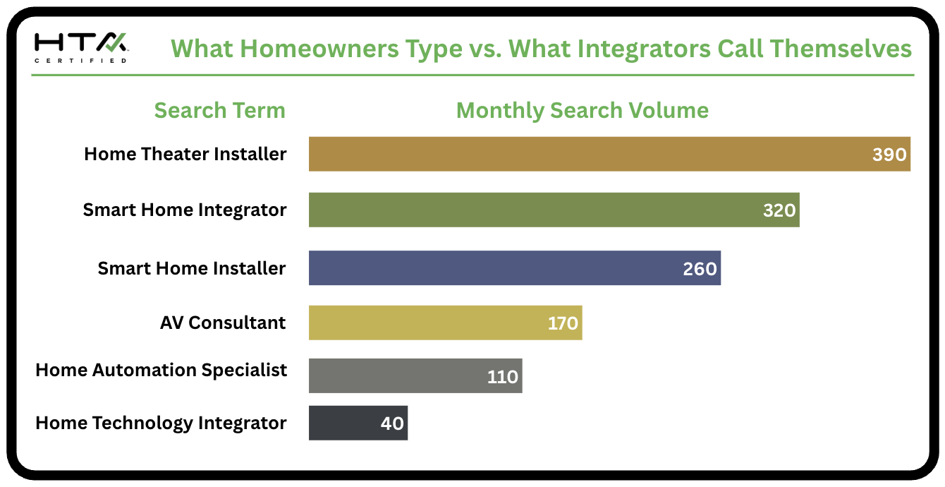 At the HTA, we like “Home Technology Integrator”—it’s precise, professional, and descriptive. But here’s the catch: homeowners don’t search for either of these terms much. They use a variety of different terms to find us.